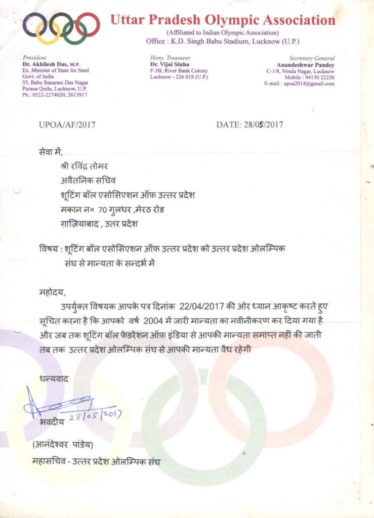 *Last election of Shooting Ball Association of Uttar Pradesh was held on dated 26.08.2021 at Ghaziabad and new Executive Committee elected as under Ajay Pal Singh – President, Anjul Aggarwal, Ravindra Singh Tomar, Tarkeshwar Singh- Vice Presidents, Jeetraj Tomar – General Secretary, Anjay Das, Santosh Singh – Joint Secretary, Sudhir Kumar – Treasurer, Pawan Kumar -Chairman Technical, Shailesh Kumar, Amar Yadav -Executive Member